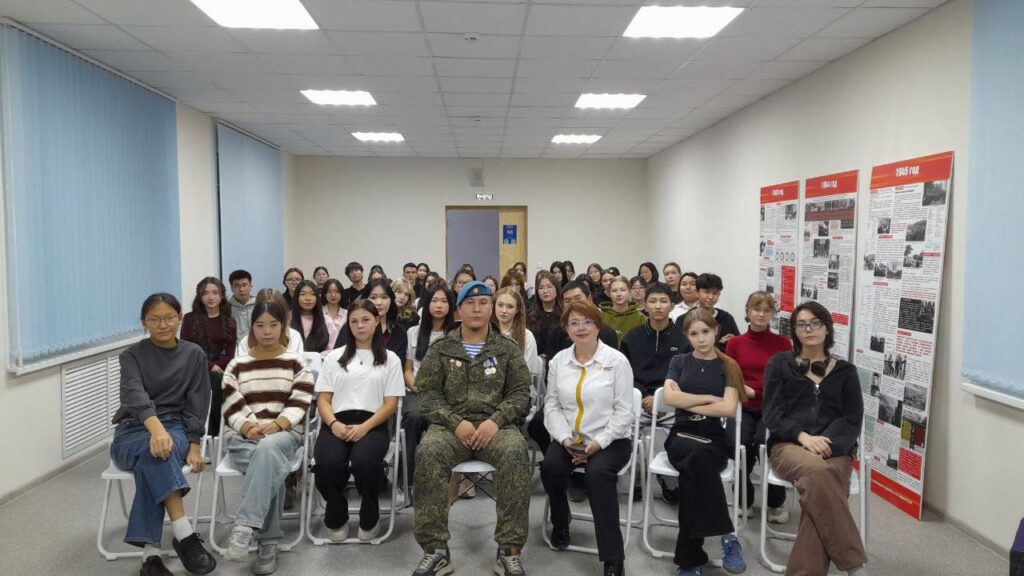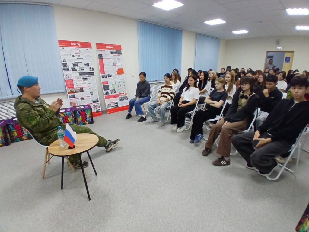 📌 В рамках плана мероприятий, посвящённых Году Защитника Отечества, в молодёжном центре Октябрьского района Республики Бурятия состоялась знаменательная встреча студентов первого курса групп 6250 и 6257 с ветераном специальной военной операции Артёмом Андреевичем Петровым.